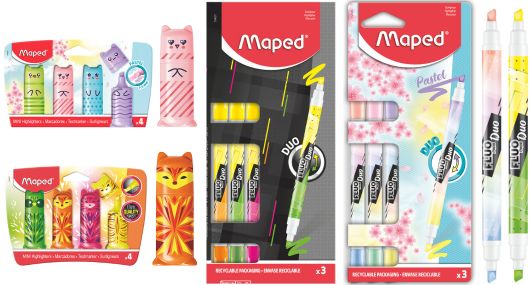 A helytakarékosság jegyében kínál megoldást a MAPED a „Mini”, illetve a „Duo” termékvonallal. Az aprócska szövegkiemelők aranyos mintával díszítettek. A „Duo” termékek esetében pedig 2 szín rejtőzik egy vékony testben, ezzel több helyet biztosítva a tolltartóban a többi írószer számára.