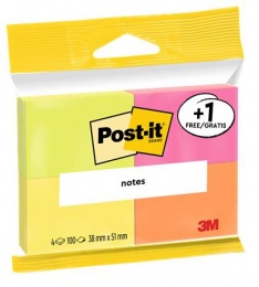 Öntapadó jegyzettömb, 38x51 mm, 4x100 lap, 3M POSTIT, "Neon"