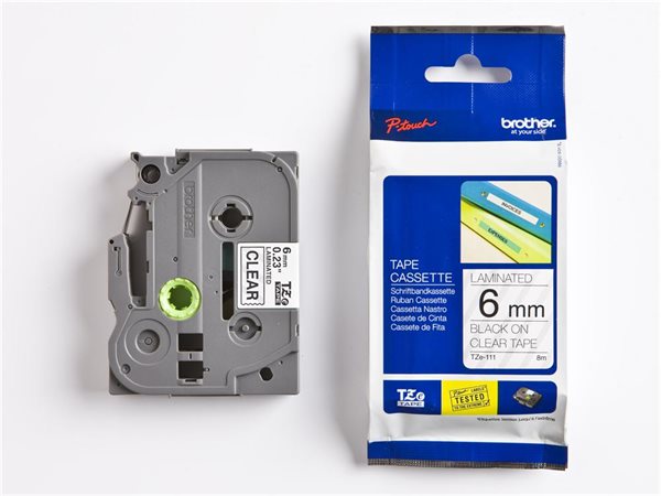 Feliratozógép szalag, 6 mm x 8 m, BROTHER, "TZe-111" víztiszta-fekete