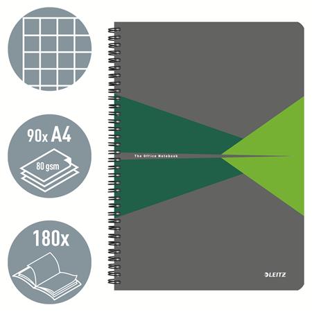 Spirálfüzet, A4, kockás, 90 lap, laminált karton borító, LEITZ "Office", szürke-zöld