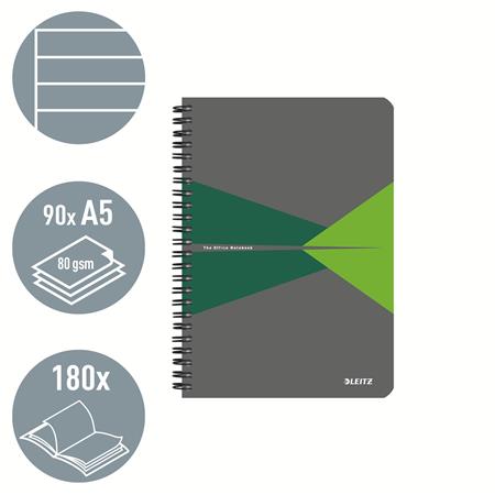 Spirálfüzet, A5, vonalas, 90 lap, PP borító, LEITZ "Office", szürke-zöld