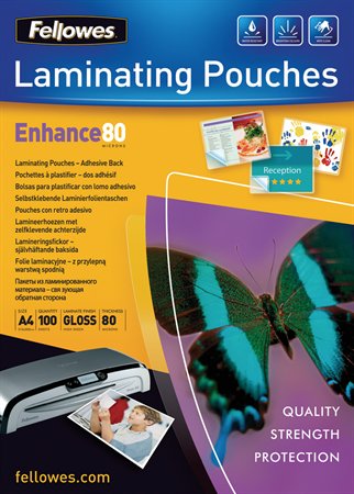 Meleglamináló fólia, 80 mikron, A4, fényes, öntapadó, 100 db, FELLOWES