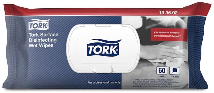 A Tork felületfertőtlenítő nedves tisztítókendője praktikus, lezárható csomagolásban érhető el.