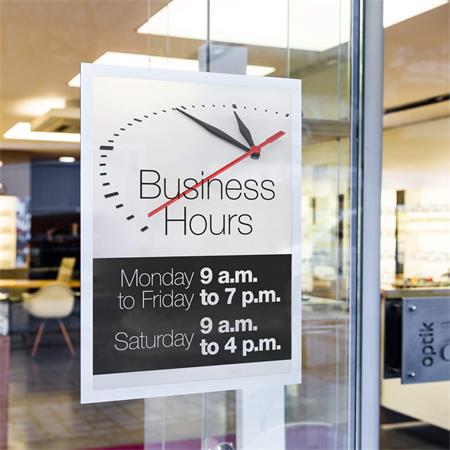 DURAFRAME® SUN, elektrosztatikusan tapadó infokeret adhézió segítségével, könnyedén, buborékmentesen rögzíthető az üvegfelülethez.