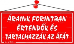 Információs tábla, 22,5x10 cm, "Áraink forintban értendők és tartalmazzák az áfát", fehér